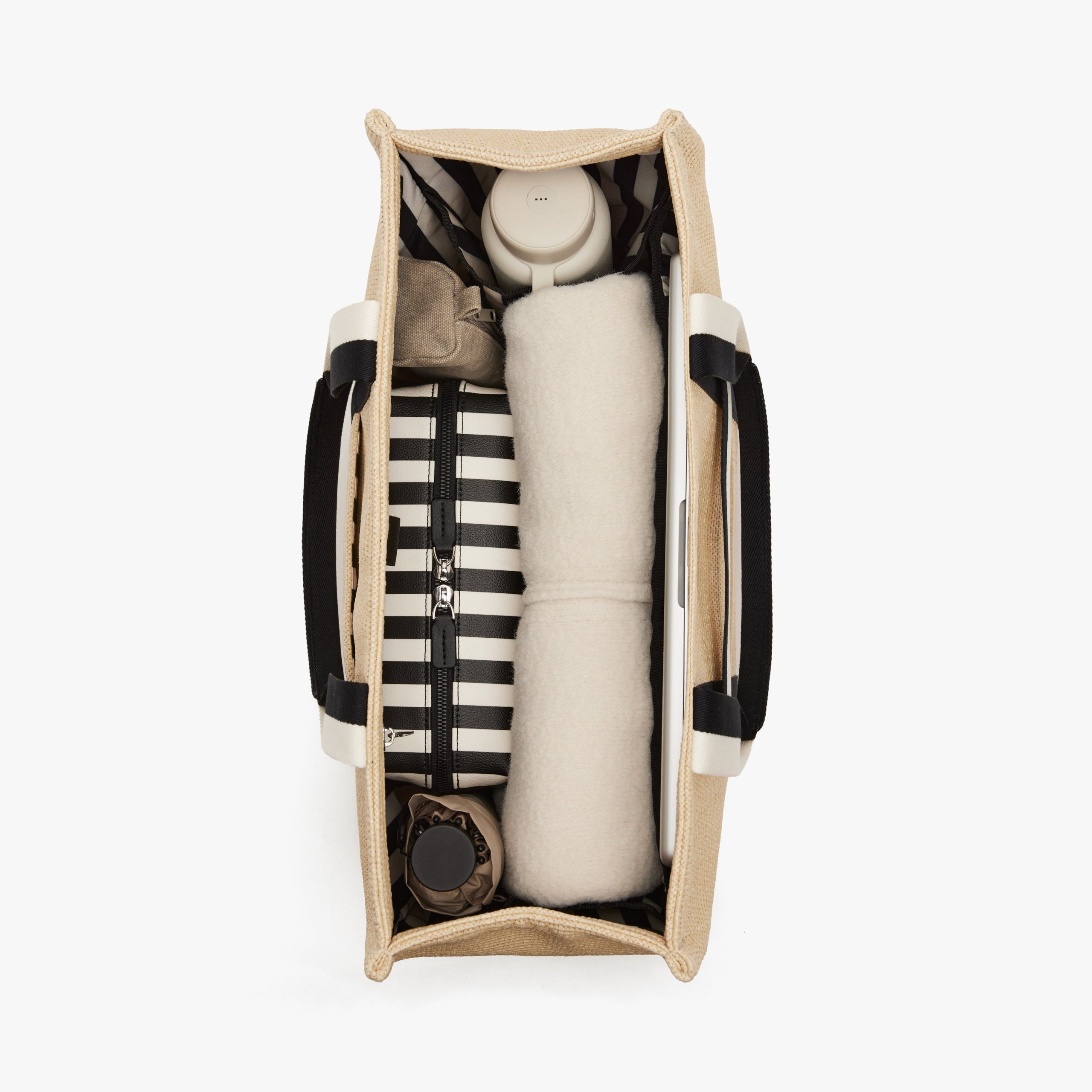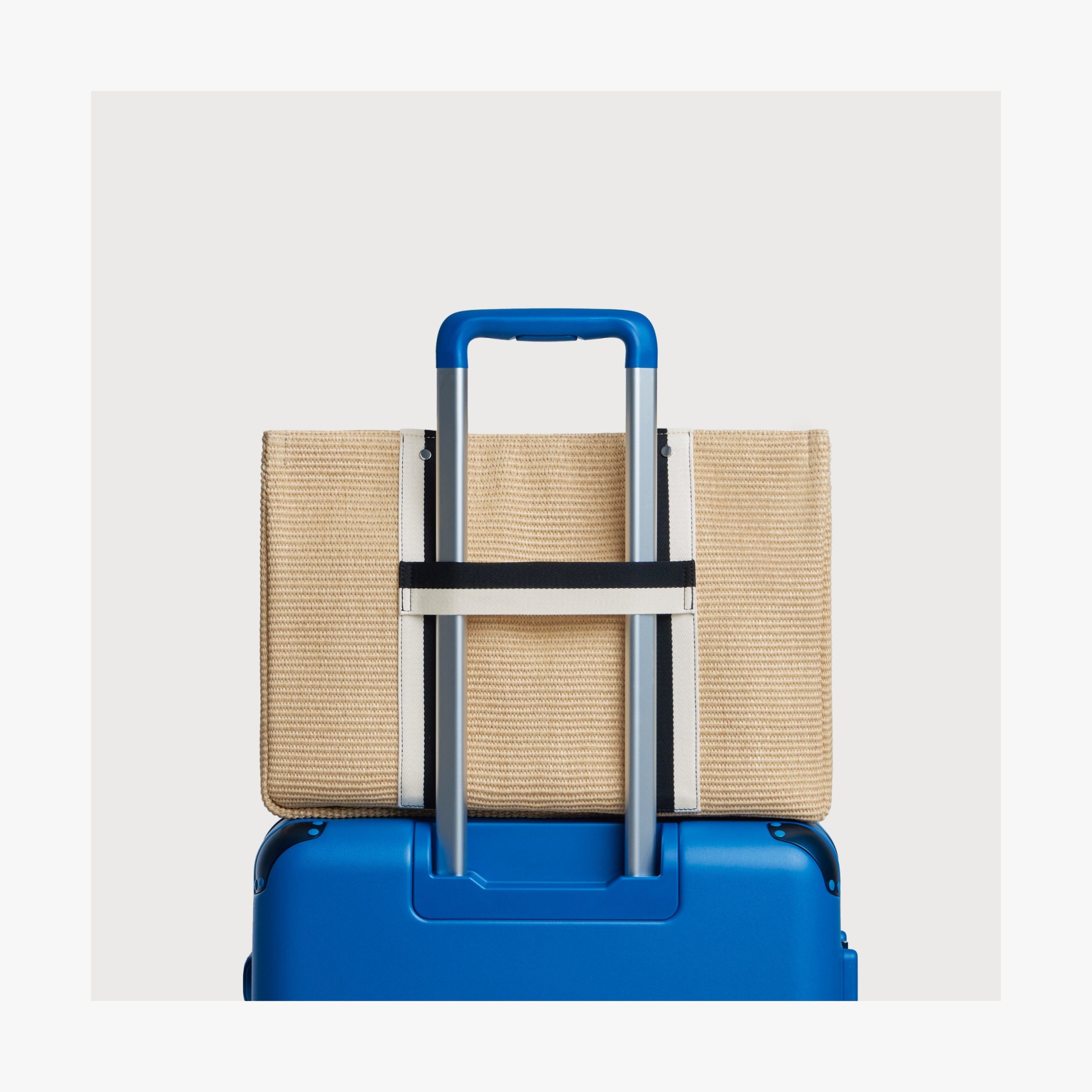 The Canopy Tote combines raffia construction. cotton straps. and a built-in trolley sleeve. Inside. a striped lining and pockets keep your laptop. water bottle. and essentials neatly organized ?C all in one playful. everyday carry.?