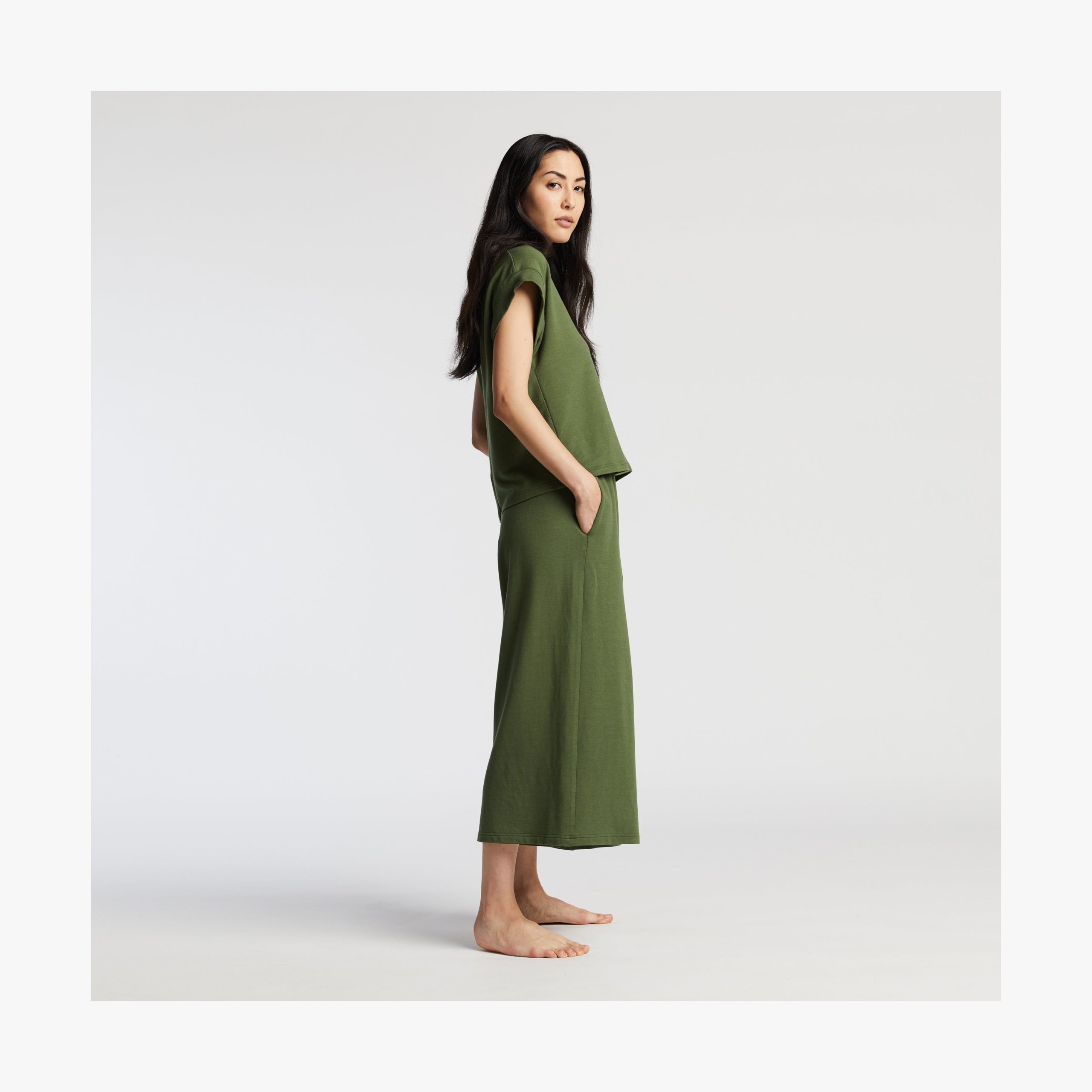 In Cypress Green. Lianne is 5’9. wearing size 2 in the top and pants.