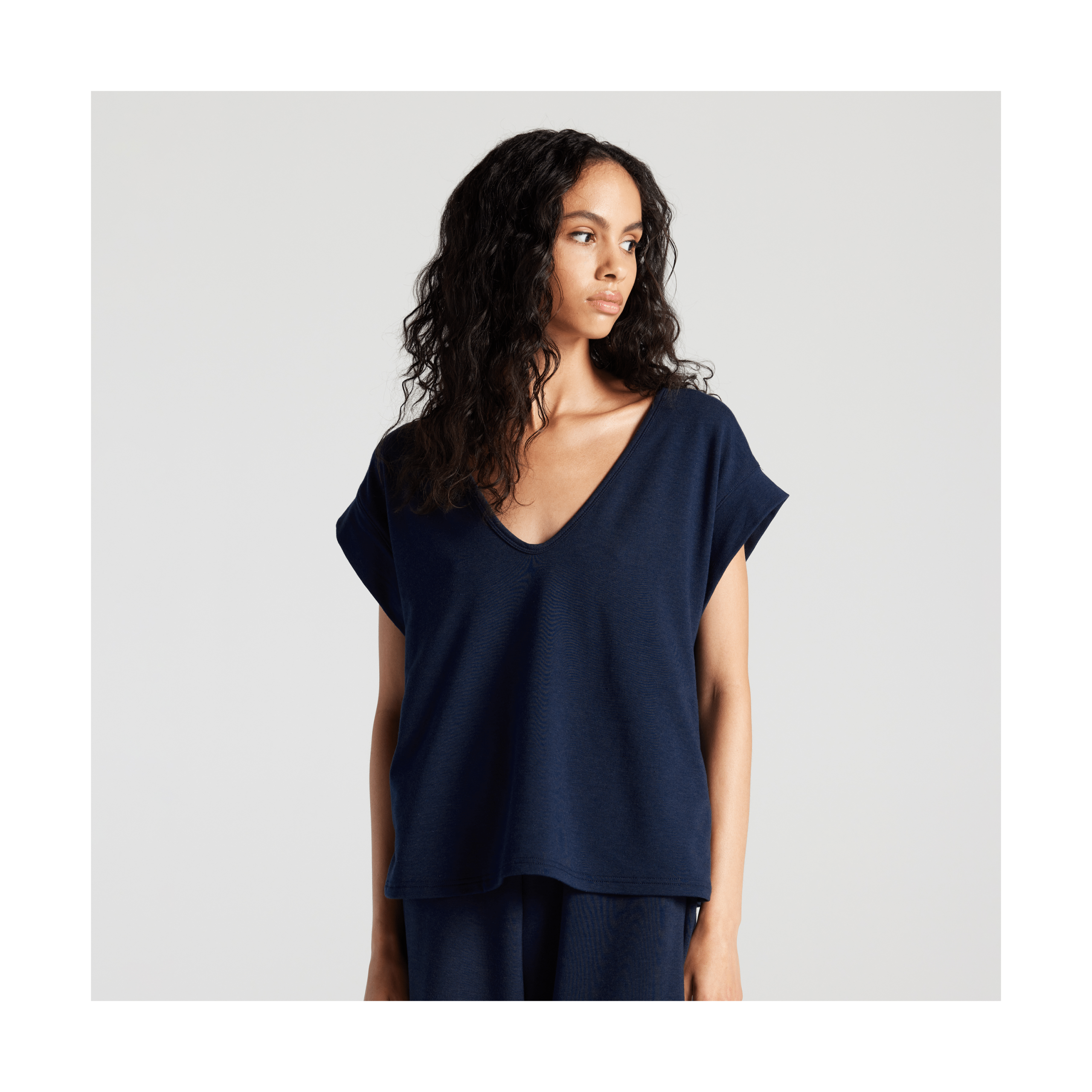 With flowing lines and a breezy. relaxed fit. the Sevilla Top is the embodiment of all-day comfort and easy elegance. Highly versatile. the short-sleeved top is front-back reversible with a V-neck on one side and a high neck on the other. providing two looks in one garment. Crafted with a supremely soft blend of sustainable bamboo rayon and breathable cotton. this airy top has a natural lustre and form-flattering drape. Pair with our Sevilla Pants for head-to-toe comfort wherever you go.
