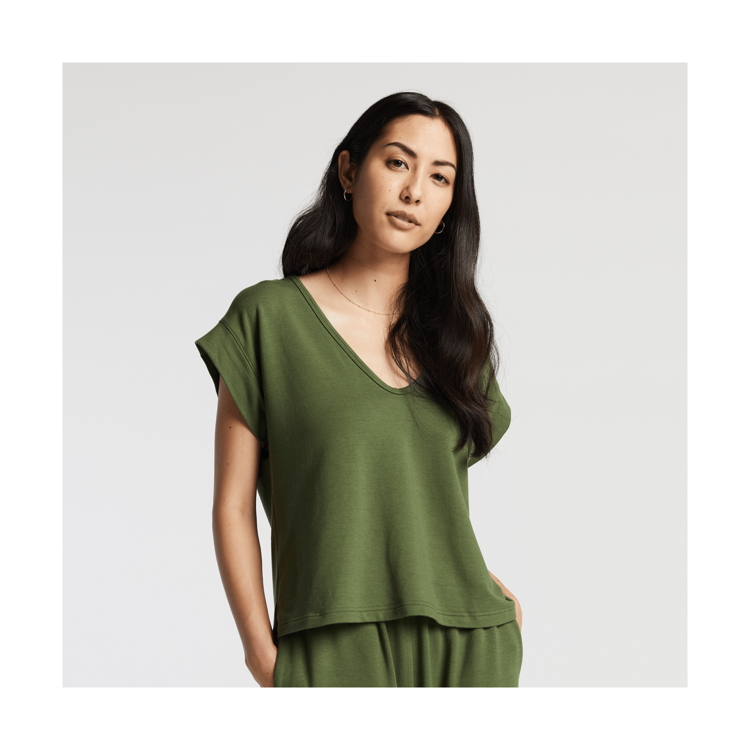 In Cypress Green. Lianne is 5’9. wearing size 2 in the top and pants.